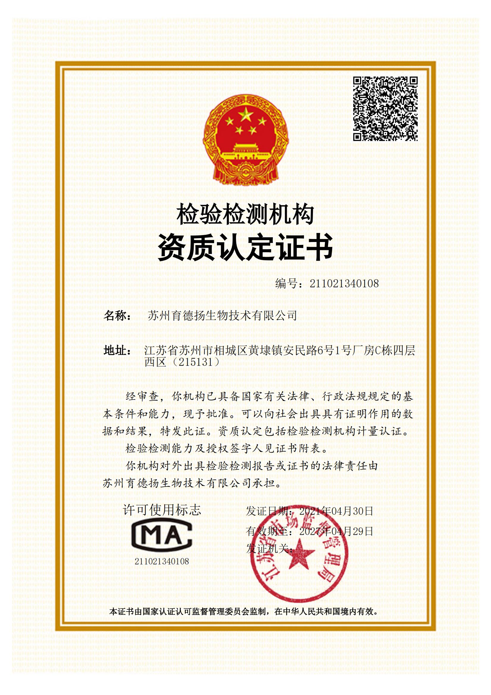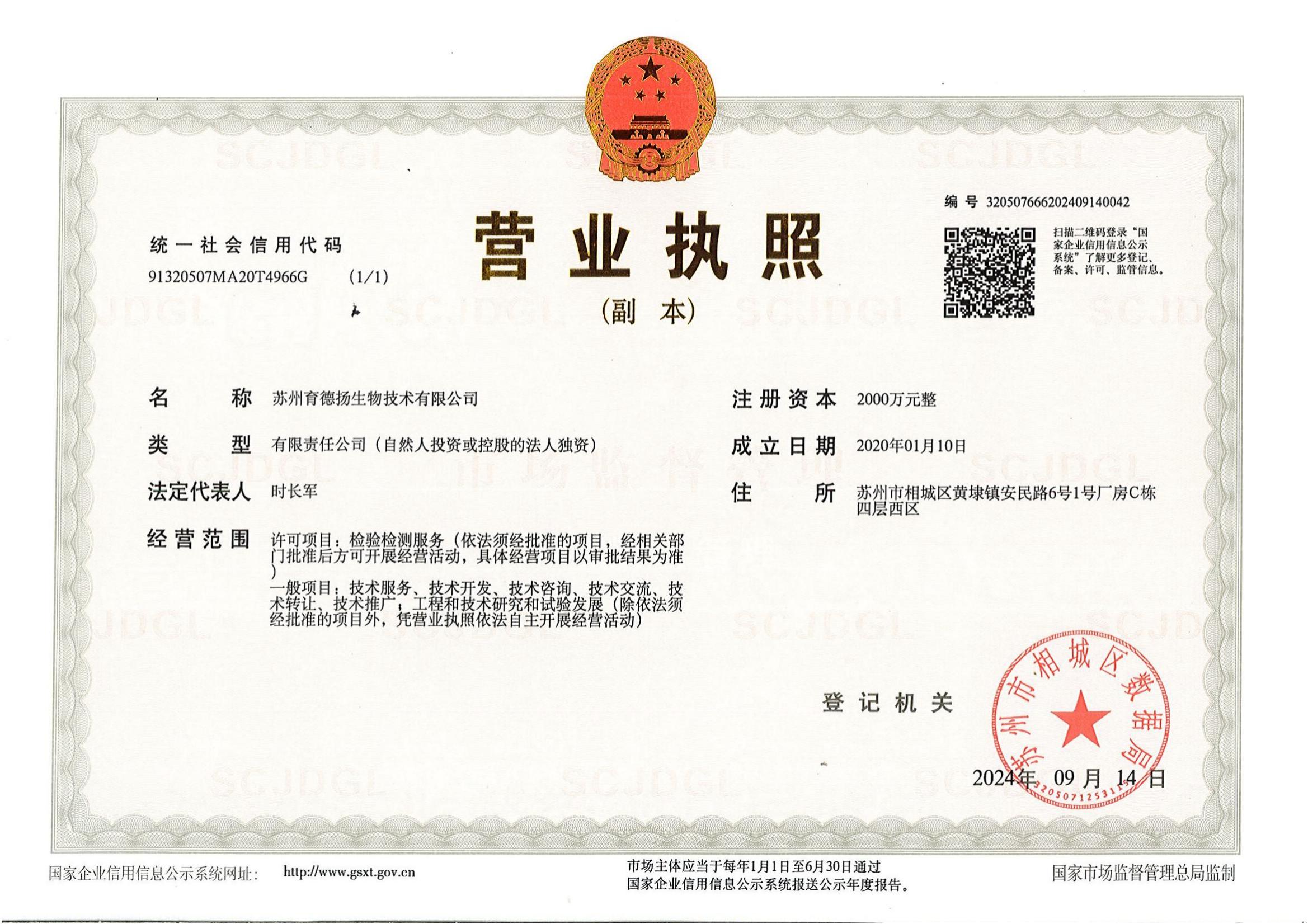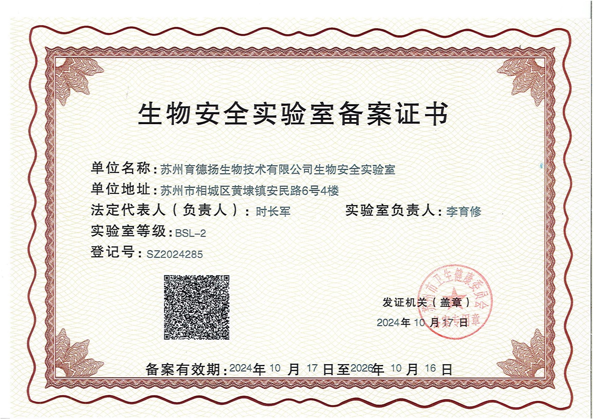 苏州育德扬生物技术有限公司(以下简称苏州育德扬生物)成立于2020年,是一家致力于为全球生物医药企业及机构提供生物安全检测服务的国际化平台。可为客户提供符合中、美、欧等国家与区域申报标准的生物安全性检测服务及客制化病毒检测服务。苏州育德扬生物已通过多家生物医药企业审计,并建立了良好的沟通与合作,已累计为上百个项目提供了生物安全检测服务,成功协助数十个项目在中国、美国、欧洲、澳大利亚、新西兰取得IND或BLA批件。目前,已通过欧盟QP与中国药监局(NMPA)现场查核,并取得检验检测机构资质认定证书(CMA)、中国合格评定国家认可委员会(CNAS)、ISO9001资质认证与美国FDA FEI编号。苏州育德扬生物严格遵循各国药典和国内外法规,始终恪守全球最高质量标准,确保检测数据完整及结果的真实有效,其符合国际质量标准的生物药物评价体系,支持生物制剂、细胞基因治疗、核酸药物、疫苗等生物药物产品质量评价。